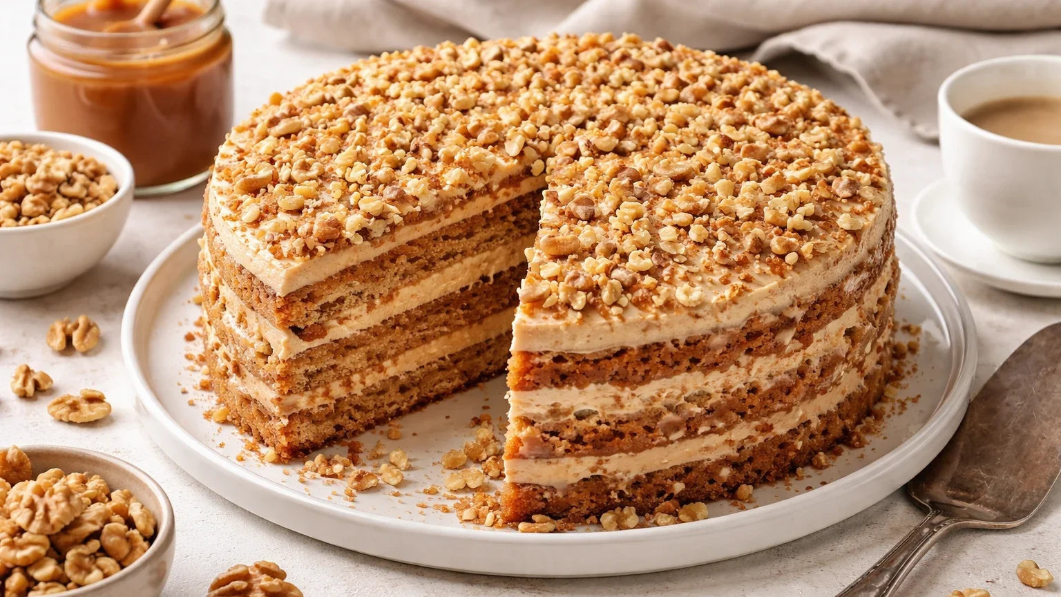 В итоге вы получите идеальный торт, в котором сочетаются карамельные, медовые и ореховые ноты. Это универсальный десерт для праздничного стола или уютного семейного чаепития.