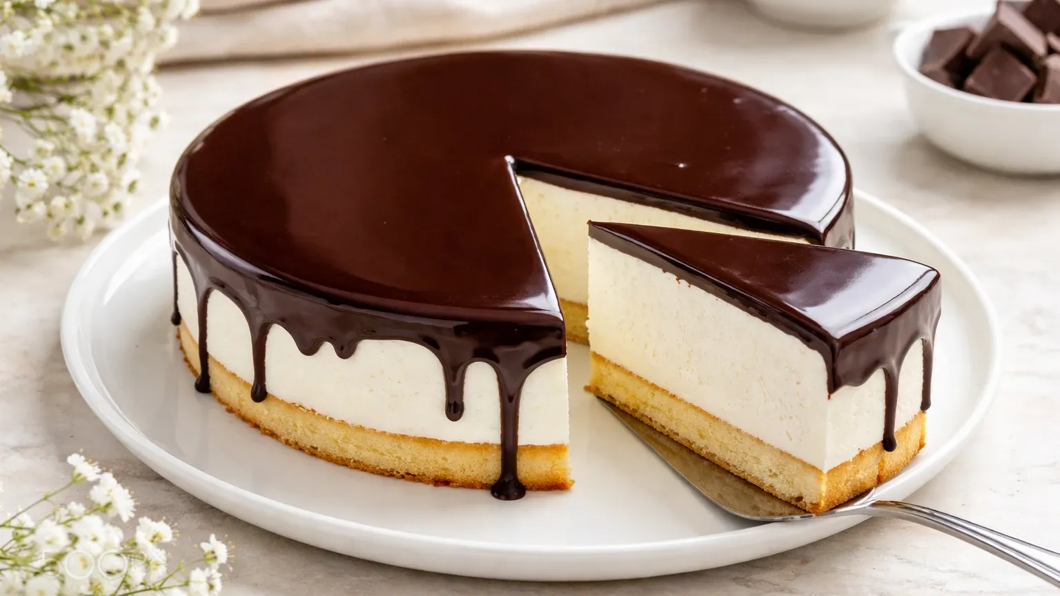 Растопите тёмный и молочный шоколад по 100 г каждого вместе с 2–3 ст. ложками растительного масла до однородной консистенции. Остудите глазурь до 30–32 °C и покройте охлаждённый торт. Поверхность должна стать ровной и блестящей, как зеркало.